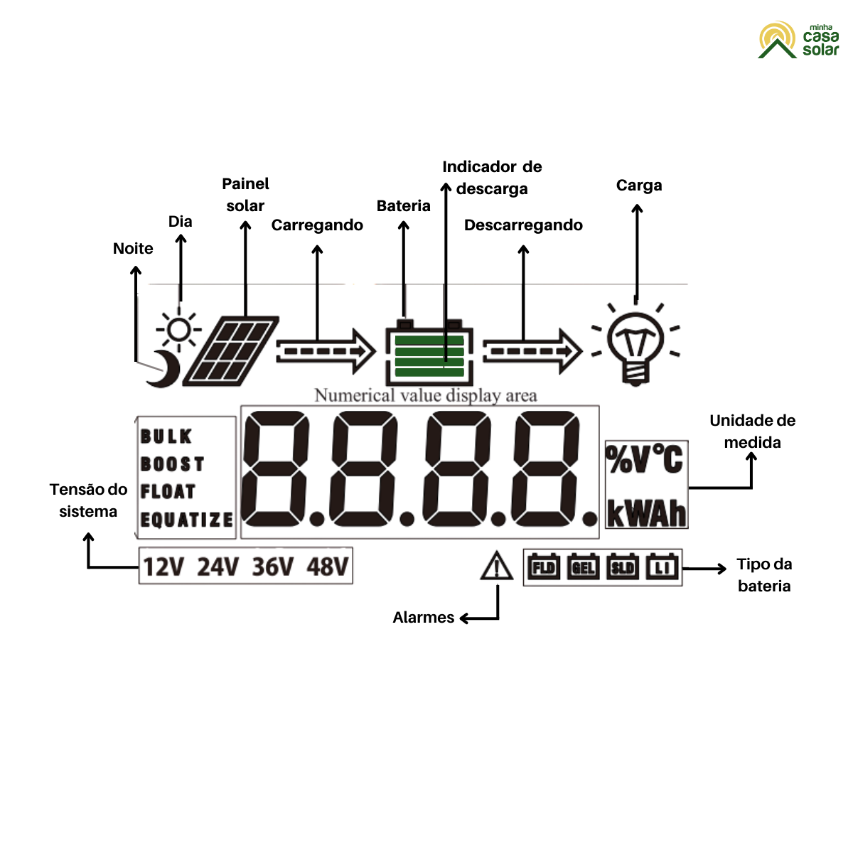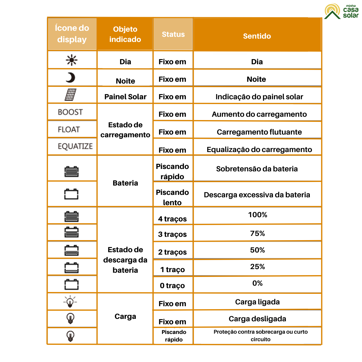 Sem carregamento mesmo com luz solar presente | Verifique se o painel solar está conectado corretamente e com bom contato. Verifique se a tensão do painel solar não está abaixo da tensão da bateria. |