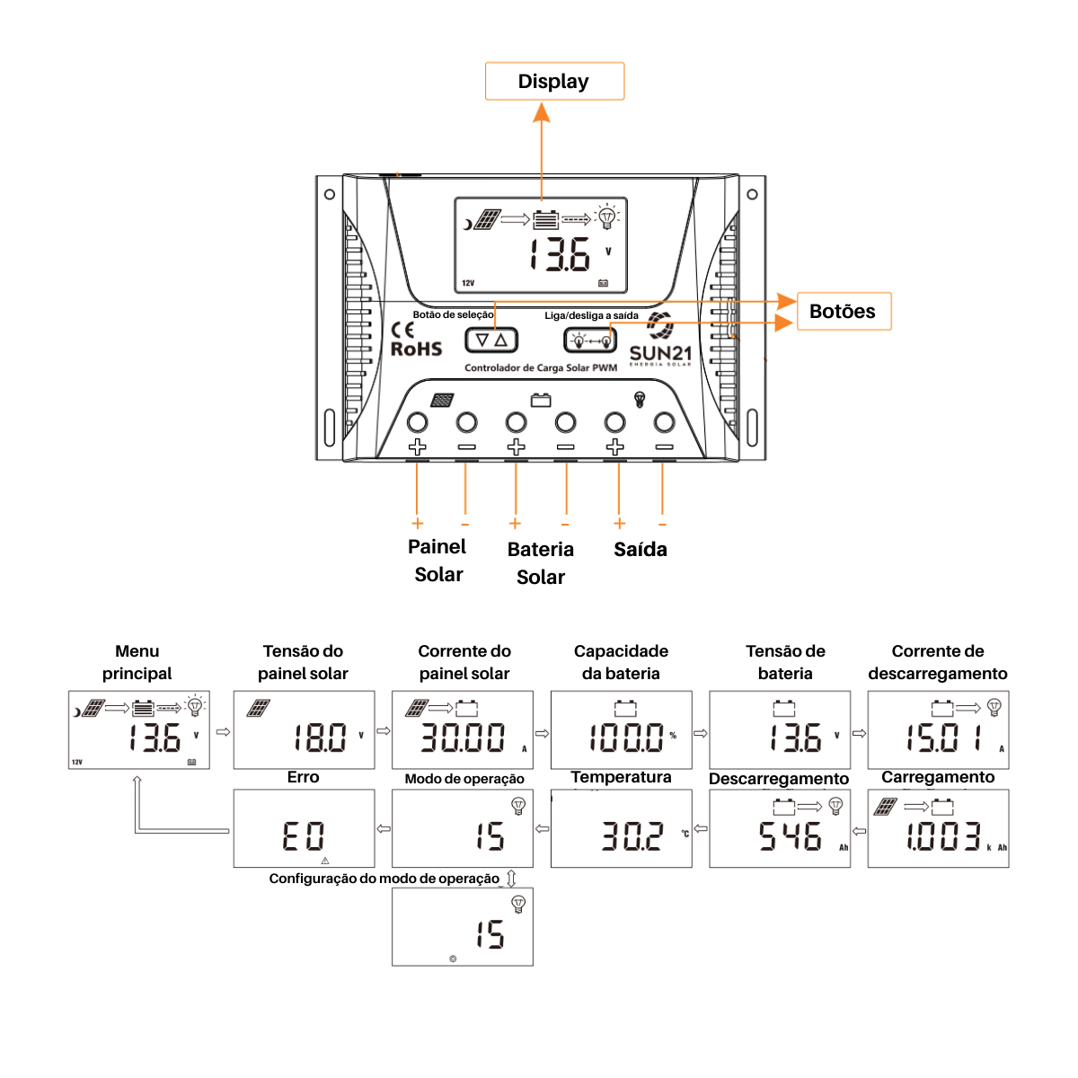 Controlador de carga 12/24V 60A SUN21 PWM, compatível com baterias de lítio e chumbo-ácido, com gestão eficiente das cargas. Permite controle da saída, incluindo liga/desliga, função luz noturna e temporizador programável. Suporta até 1800W em 24V e 900W em 12V, garantindo operação estável e segura.
