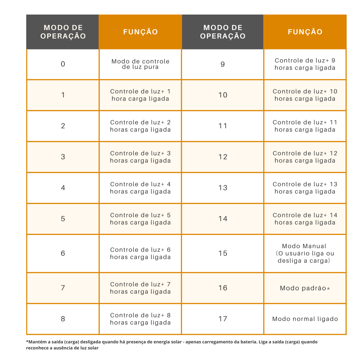 Com até 17 modos de configuração, o controlador permite ajustar a operação de acordo com a necessidade de cada sistema, seja para proteger a bateria, otimizar cargas ou adaptar o funcionamento a horários específicos. Essa flexibilidade garante maior eficiência e personalização do desempenho. Observe abaixo os modos em que você pode configurar o seu controlador!