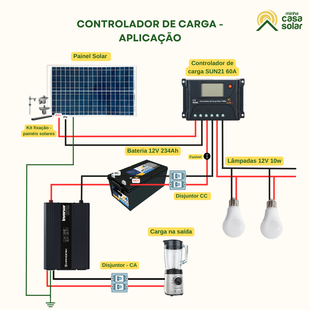 Pode ser aplicado para iluminação de casas, chácaras e sítios, garantindo energia estável mesmo em locais isolados. Também é ideal para cercas elétricas, câmeras de segurança, roteadores, sistemas de monitoramento e pequenas automações.