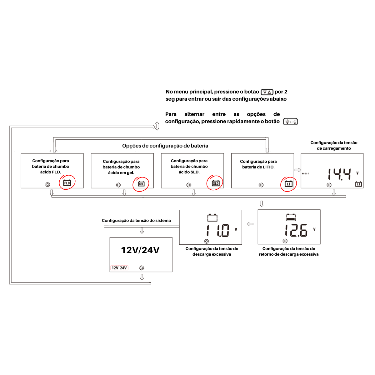 Para realizar qualquer configuração no seu controlador, é muito simples! Quando o modo de carregamento for exibido, pressione por um tempo (aproximadamente 2 segundos) o botão de seleção. Após isso, pressione o botão que liga/desliga a saída em cliques rápidos para ajustar o parâmetro de acordo com o desejado. Depois de selecionar o parâmetro desejado, pressione novamente por um tempo o botão de seleção para salvar suas configurações.