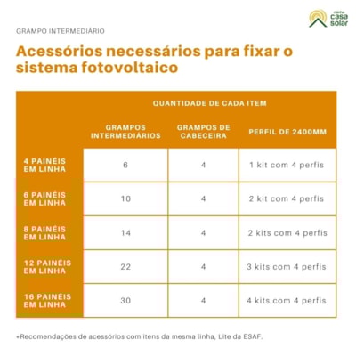 O clamp intermediário de fixação da ESAF realiza o travamento entre placas solares com espessura de 35mm a 40mm. O grampo intermediário é feito de  alumínio de alta resistência e possui parafuso e porca em aço inoxidável 304. Fabricado para suportar ventos de até 180km/h no telhado, atendendo as necessidades de todas as regiões do Brasil. Compatível com demais acessórios da linha Lite da ESAF e conta com 20 anos de contra defeitos de fabricação.