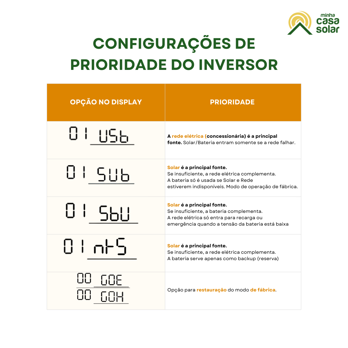 O inversor oferece vários modos de prioridade de energia. No modo USB, a rede elétrica é a fonte principal, usando solar e bateria apenas quando a rede falha.