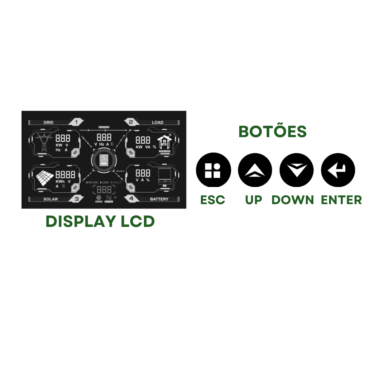 Observação: este inversor fornece até 5000W (5,0 kW) em operação 100% off-grid (solar e/ou baterias). A potência de até 6200W (6,2 kW) é atingida apenas em modo bypass, com rede elétrica ou gerador auxiliando as cargas. Em caso de dúvidas, entre em contato pelo (31) 3479-1400.