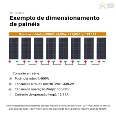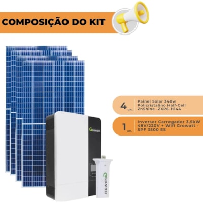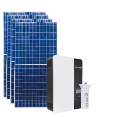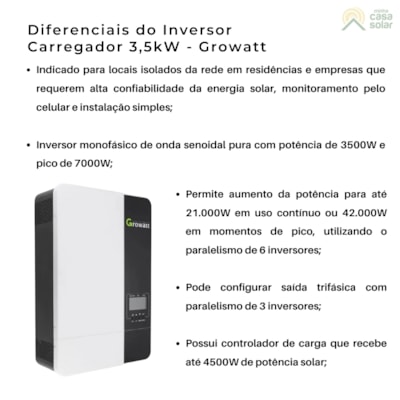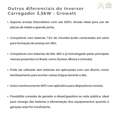 1 unidade do Inversor Carregador 3,5kW 48V/220V + Wifi Growatt - SPF 3500 ES: este inversor carregador Growatt apresenta potência de 3500W em uso constante e 7.000W de pico, com tensão de saída de 220V. O equipamento é compacto, mede 330 x 485 x 135mm e pesa 11,5kg. O controlador de carga MPPT embutido suporta 4500W de potência de painéis solares, respeitando a tensão máxima solar de 430V. O SPF 3500 ES é compatível com banco de baterias em 48V, tanto de lítio, quanto de chumbo-ácido. O equipamento já foi homologado para uso com baterias de lítio das marcas Dyness, Moura, Unicoba e Growatt. O inversor carregador realiza a comutação entre as fontes de modo automático. Por exemplo, em dias chuvosos, a energia gerada pelos painéis solares pode não ser suficiente e o banco de baterias ser descarregado. Para evitar o desligamento das cargas (equipamentos conectados), a fonte secundária, como um gerador ou a rede da concessionária, é utilizada como fonte de alimentação e recarrega o banco de baterias, garantindo o funcionamento pleno dos equipamentos conectados no sistema. Por assegurar disponibilidade de energia, 24 horas por dia, este inversor Growatt é ideal para aplicações críticas, como sistemas de telecomunicações, aplicações de segurança, equipamentos de resfriamento, dentre outros. Em aplicações isoladas da rede, a energia das placas solares e das baterias pode ser complementada com a energia da entrada CA conectada em um gerador a diesel/gasolina. Caso as baterias sejam descarregadas devido ao clima, como em dias chuvosos ou com nebulosidade, um gerador a diesel/gasolina pode ser utilizado temporariamente para recarregar as baterias e alimentar as cargas elétricas. Há inclusive possibilidade de acionamento remoto do gerador via contato seco.
