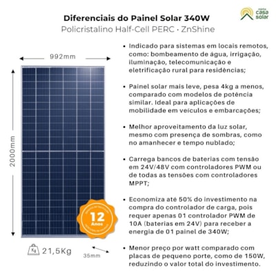 4 unidades do Painel Solar 340w Policristalino Half-Cell ZnShine - ZXP6-H144 : este painel solar XP6-H144 fabricado pela ZNSHINE com vidro temperado de alta transmitância, moldura de alumínio anodizado, produz tensão de 38,20V (Vmp) e corrente de 8,91A (Imp). Combina células de silício policristalino com as tecnologias Half-Cell e 5 busbar, entrega eficiência média de 17,14%. O ZXP6-H144 é um painel solar leve que pesa apenas 21,5kg e mede 2000 x 992 x 35mm, ideal para aplicações de mobilidade em veículos e embarcações, eletrificação rural em residências, sistemas de bombeamento de água e irrigação de pequeno porte. Conta com 12 anos de garantia contra defeitos de fábrica.