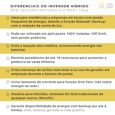 1 unidade do Inversor Hibrido 5kW 220V Monofásico 2MPPT Deye - SUN-5K-SG04LP1-EU-SM2: O inversor híbrido (On-Grid+Off-Grid) de 5000W, monofásico, 220V da Deye têm paralelismo para aumento de potência e formação de rede trifásica (mín. 3 un.). É ideal para residências e empresas com queda frequente de energia (backup) que também desejam reduzir gastos na conta de luz, para eletrificação rural e sistemas Grid Zero (dispensa homologação).