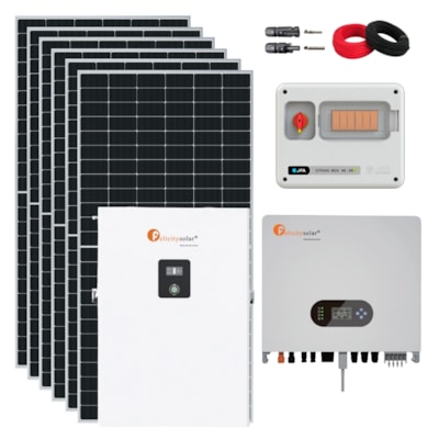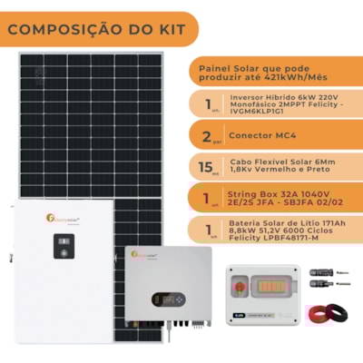 Kit solar híbrido composto por painéis solares monocristalinos de 585W, com corrente de 13,52A (Imp) e tensão de 43,27V (Vmp), tecnologia Half-Cell N-Type TOPCon, inversor híbrido Felicity 6kW 220V monofásico 2MPPT e bateria de lítio Felicity 171Ah 8,8kWh 48V. Ideal para sistemas Off-Grid e híbridos, permitindo o uso contínuo de energia em locais remotos, residências, trailers ou embarcações.
